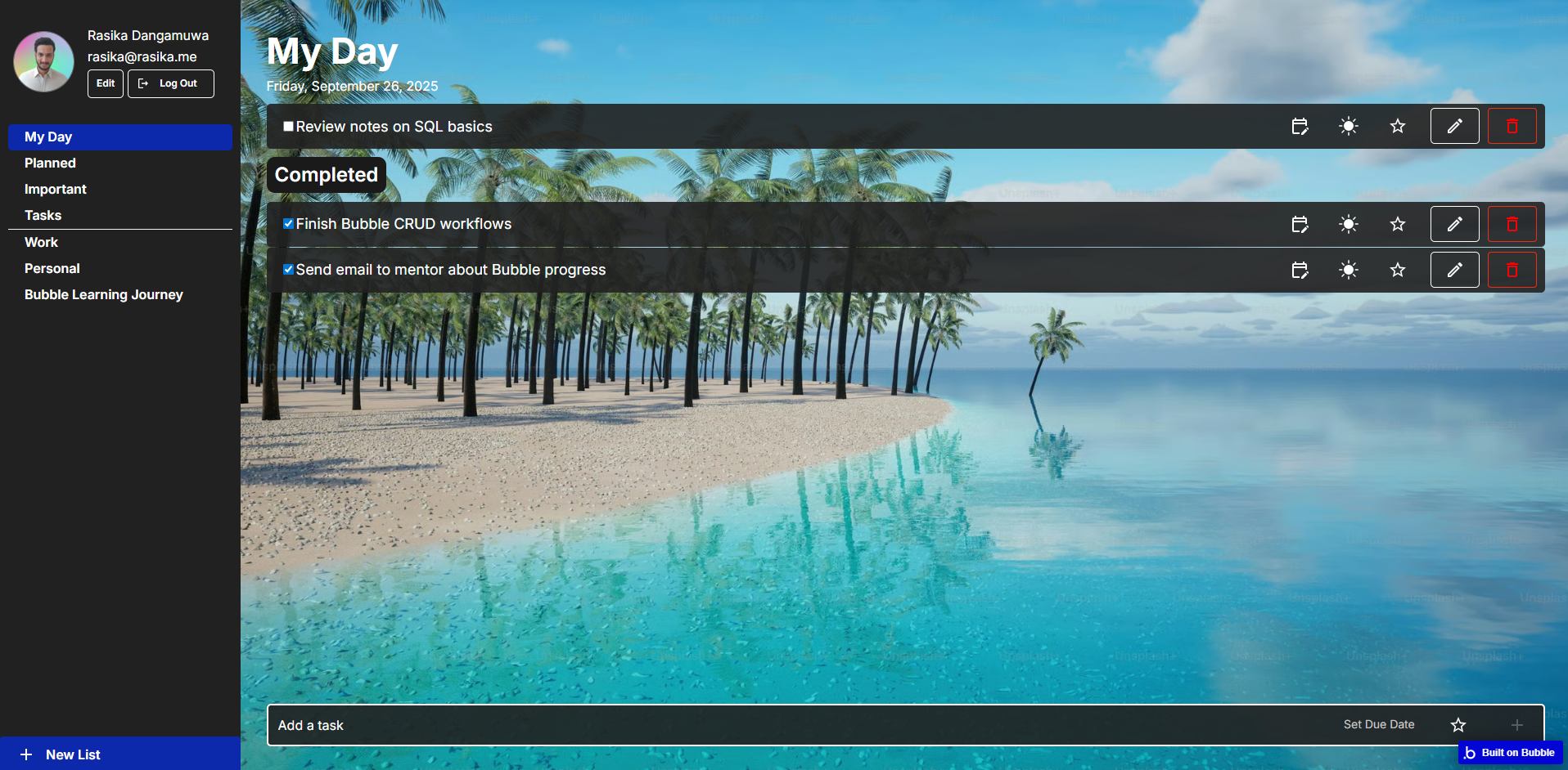A fully functional task management application built with Bubble.io, featuring task creation, editing, tracking, and responsive workflow automation for enhanced productivity.